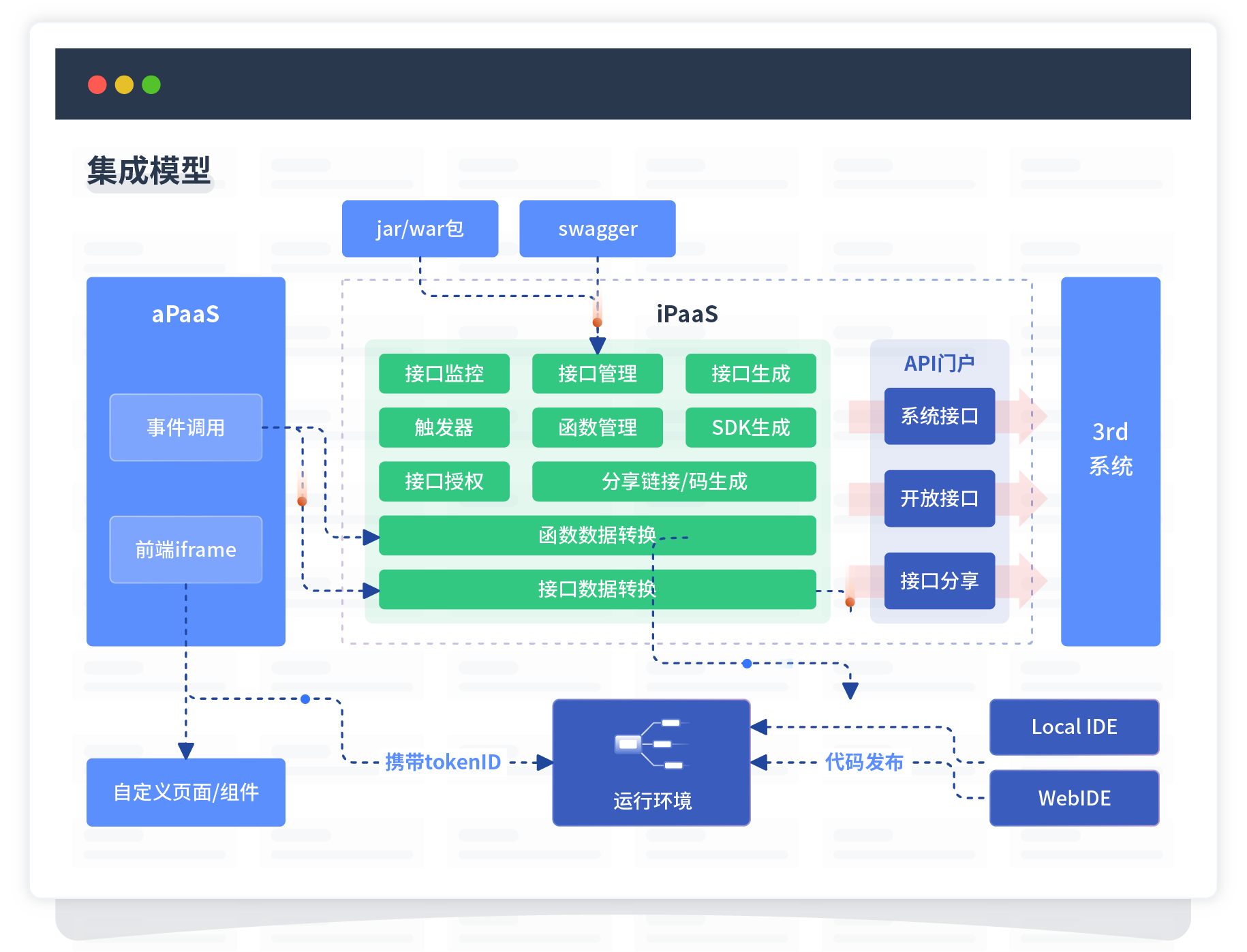 集成模型包括平台本身前、、、、后端能力的扩展,,也支持通过API门户和第三方系统进行交互。。。。
