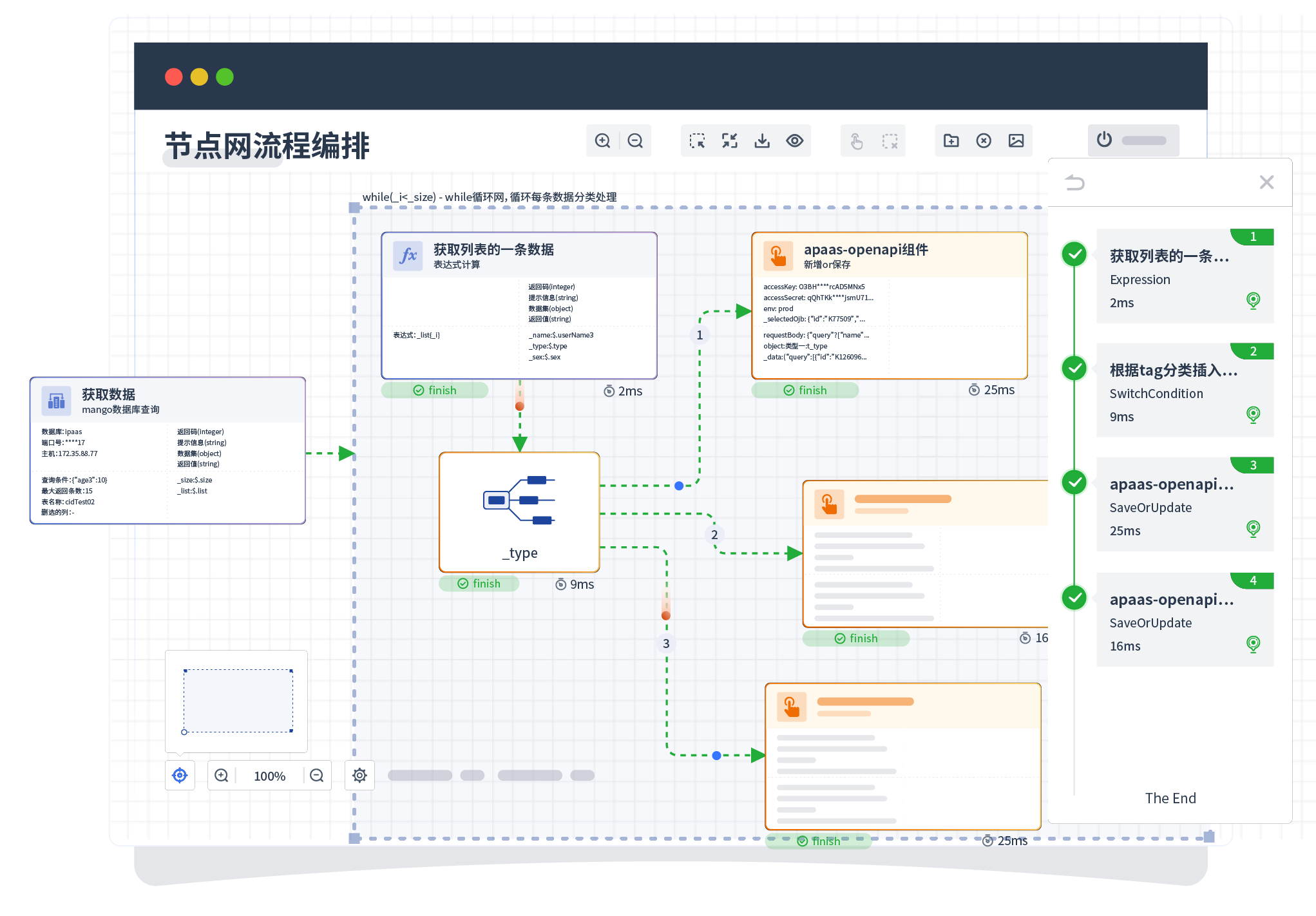 针对集成场景,,组件定义后支持进行流程编制,,,,不同于传统代码方式,,,通过图形化展示,,支持在线调试、、日志查看和运行回放。。。。