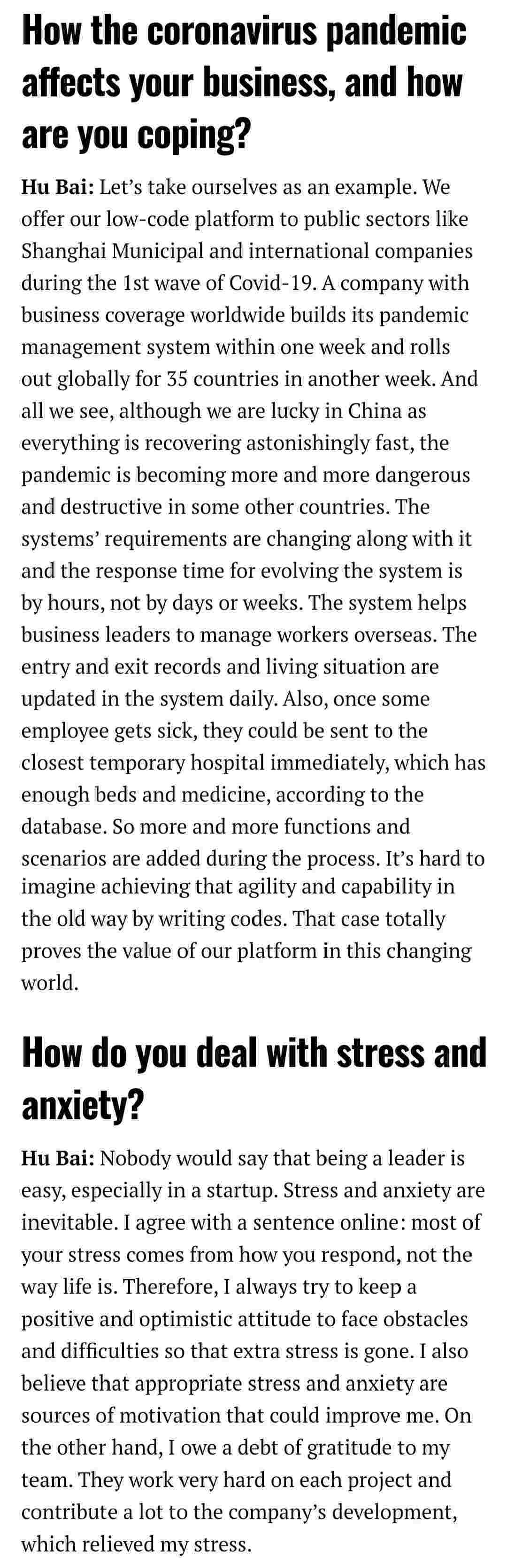 2021年年初,,爱湃斯科技CEO胡柏受邀接受法媒Startup.info的专访,,,,与Startup info的读者分享了自己的创业经历、、、、以及低代码平台沃钱包的创新之处。。